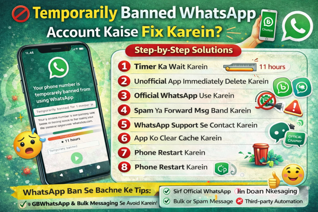 Agar aapka WhatsApp account temporarily banned ho gaya hai, to sabse pehle panic na karein. Timer complete hone ka wait karein aur ensure karein ki aap official WhatsApp app hi use kar rahe hain.